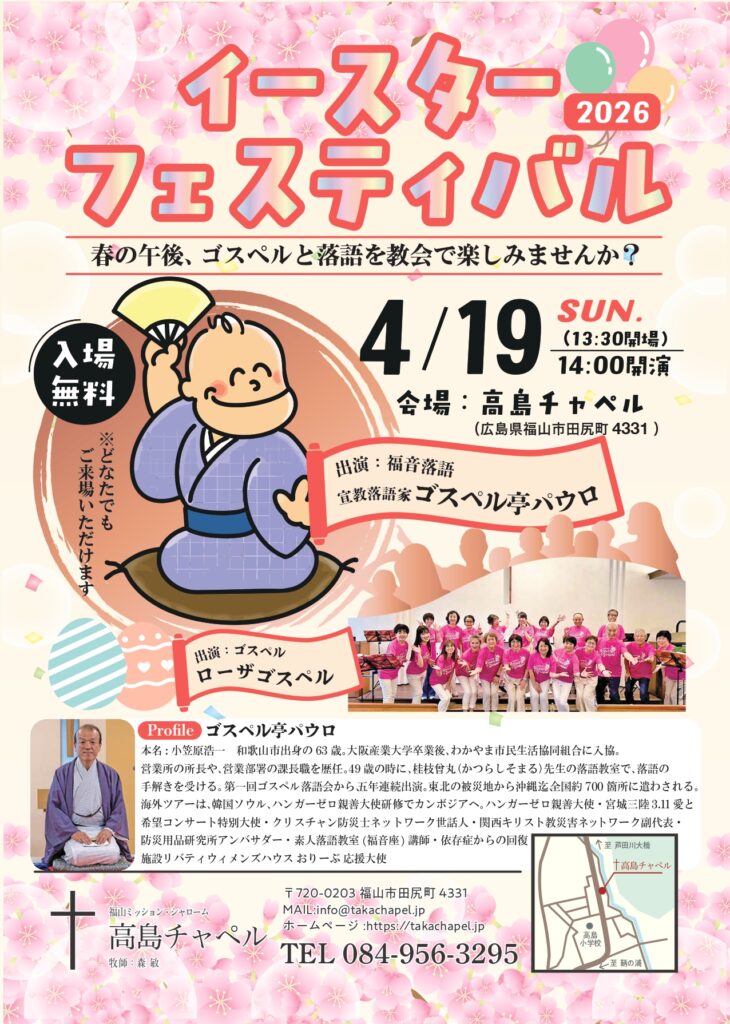 4月19日日曜日13時30分から福山市田尻町高島チャペルでイースターフェスティバル2026を開催します。春の午後、ゴスペルと落語を教会で楽しみませんか?ゴスペルは福山市内を中心に活動するローザゴスペル。素敵な歌声を聞かせてくれます。また、落語は福音落語家 ゴスペル亭パウロ。楽しい落語といっしょにゴスペルのメッセージを伝えてくれます。入場料は無料です。駐車場もあります。どなたでもご参加頂けます。みなさんのお越しお待ちしております。