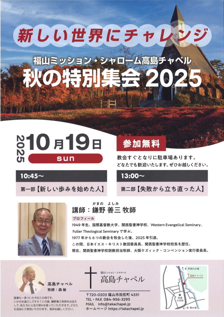 秋の特別伝道集会が開催されます! 2025年10月18日 | 教会イベント 明日、2025年10月19日 10時45分から、そして13時から秋の特別伝道集会を開催します。講師は関西聖書神学校説教担当牧師 鎌野善三牧師です。どなたでも参加できます。是非、お誘いあわせの上、高島チャペルへお越しください。